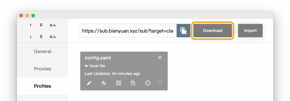3.在 Profiles 页面顶部,输入 Clash 配置订阅链接,然后点击 Download 下载配置文件。