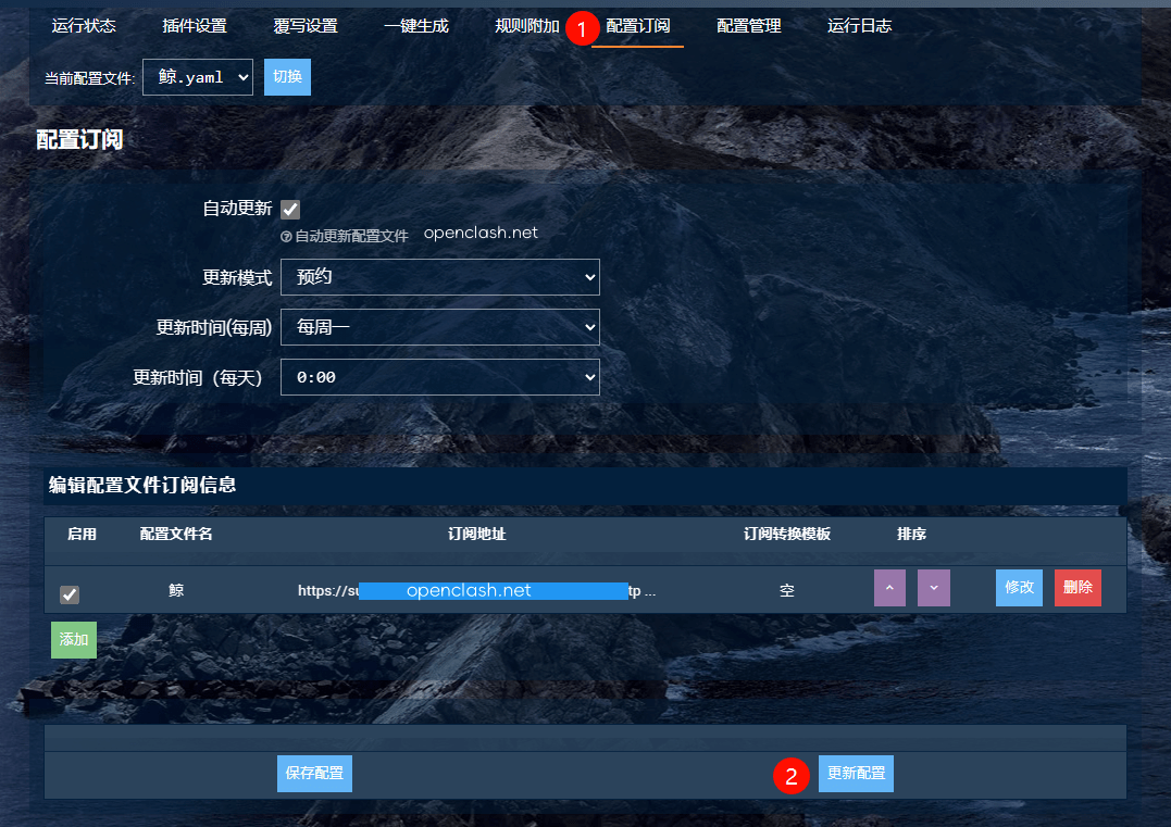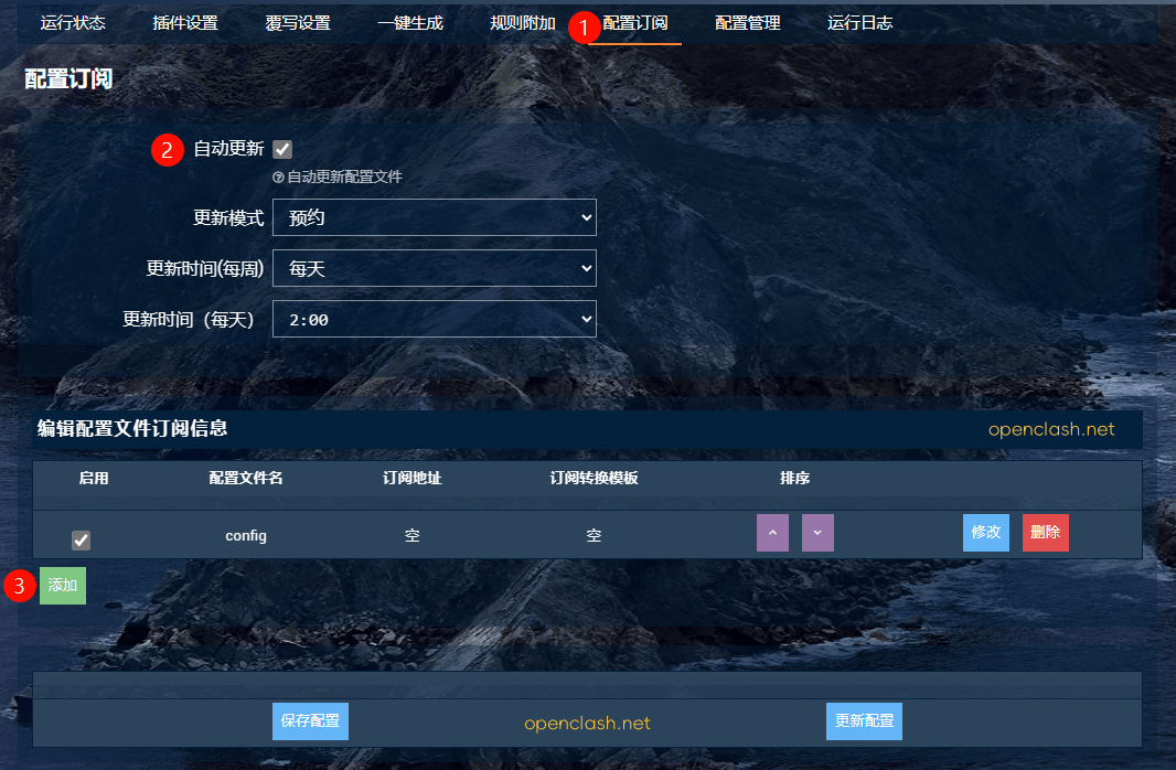 1、打开 OpenClash → 点击「配置订阅」 → 勾选「自动更新」 → 点击「添加」,如下图
